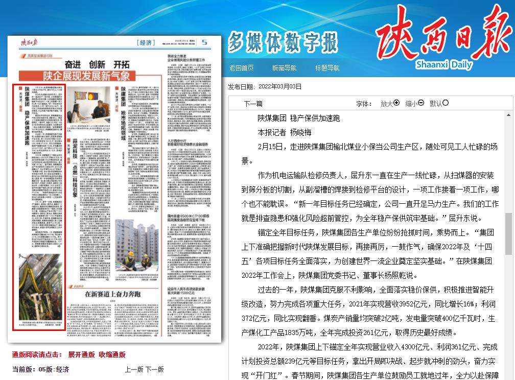 2022年,陜煤集團上下錨定全年實(shí)現營(yíng)業(yè)收入4300億元、利潤361億元、完成計劃投資總額239億元等目標任務(wù),拿出開(kāi)局即決戰、起步就沖刺的勁頭,奮力實(shí)現“開(kāi)門(mén)紅”。春節期間,陜煤集團各生產(chǎn)單位鼓勵員工就地過(guò)年,全力以赴保障生產(chǎn),充分發(fā)揮龍頭企業(yè)“壓艙石”“助推器”作用,爭分奪秒把疫情耽誤的時(shí)間追補回來(lái),助力我省經(jīng)濟穩增長(cháng)。彬長(cháng)礦業(yè)公司領(lǐng)導牽頭組成安全巡查組深入基層,第一時(shí)間將集團各項決策部署落實(shí)到一線(xiàn);榆北煤業(yè)曹家灘公司明確不停產(chǎn)、不放假工作要求,鼓勵員工就地過(guò)年,合理安排調休,2000余名員工堅守崗位穩產(chǎn)保供;陜北礦業(yè)檸條塔公司周密部署春節保供工作,煤炭日均生產(chǎn)6萬(wàn)噸……“雖然沒(méi)能回家過(guò)年,但堅守崗位為國家保供出一份力很有意義?!标儽钡V業(yè)檸條塔公司綜采一工區檢修班班長(cháng)詹海濤說(shuō)。