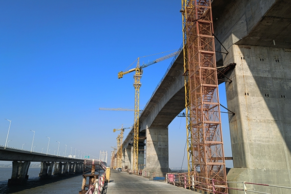 泉州灣海域風(fēng)大浪急,水域復雜,橋墩施工是此次建設中的難點(diǎn)。按照施工要求,在主墩的建設中,福建開(kāi)輝公司共投入4臺塔機,頂升最終高度達168米。由于海面高空作業(yè),塔身晃動(dòng)非常大,為塔機標準節的加降帶來(lái)極大困難?,F場(chǎng)技術(shù)人員針對這些特殊情況,采取防范措施,增加塔機與橋墩附著(zhù)道數,最密集的地方兩個(gè)標準節就要做一道附著(zhù),有效解決了超高塔機安全施工難題。安拆及維修人員憑借嫻熟精湛的技術(shù)和扎根于內心深處的安全意識,各方溝通協(xié)調,各個(gè)環(huán)節緊密有序配合,最終圓滿(mǎn)完成了各類(lèi)挑戰。